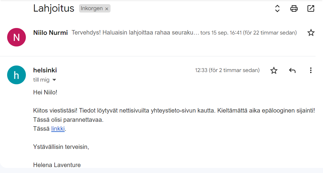 Syyskuussa 2022 lähetin heille vielä koemielessä sähköpostia: