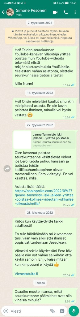 Ainoa kohtaaminen, jossa olen tietääkseni kasvotusten vuorovaikuttanut nuorisotyöntekijä Simone Pesosen kanssa, tapahtui juuri ennen tuon 29.10. lähteneen viestin kirjoittamista. Olin heidän seurakuntansa vieressä jakamassa traktaatteja, kun Pesonen tuli ovelle ja huusi parkkipaikan yli: ”Niilo, sä et voi olla täällä”. Tiesin hänet seurakunnan työntekijäksi, ja koska olin siihen asti kokenut tuon seurakunnan työntekijöiden taholta pelkästään asiatonta käytöstä, otin turvallisuussyistä kameran esiin. Pesonen väisti sillä sekunnilla sisätiloihin eikä mitään uhkaavaa tapahtunut, joten en julkaissut mitään materiaalia. Jäin paikalle ja eräidenkin ihan asiallisesti käyttäytyvien miesten kanssa juttelin yli puoli tuntia siinä parkkipaikan nurkalla – he eivät siis karttaneet minua.