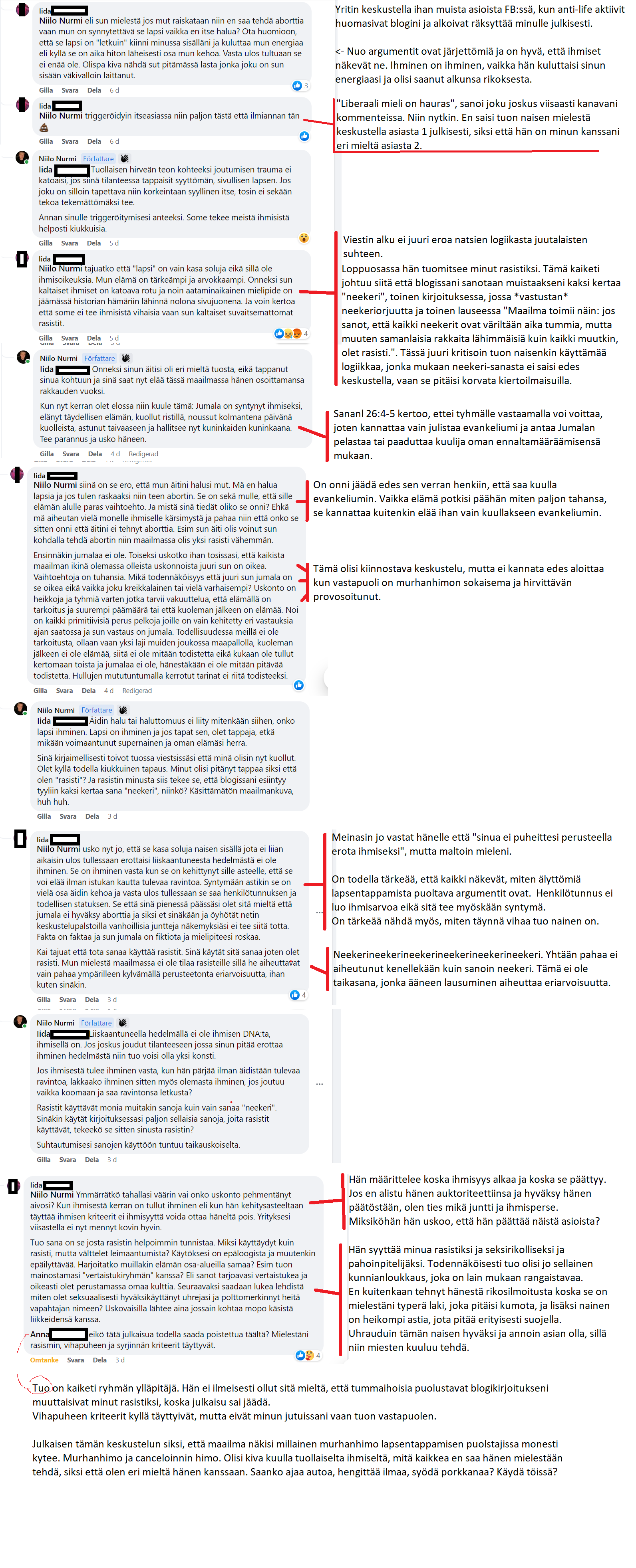 Halusin julkaista osan tuota keskustelua, koska siitä näemme kiinnostavalla tavalla sen hillittömän vihan ja murhanhimon, mikä lapsentappamista puoltavissa ihmissä usein kytee. Tuollaisia keskuteluja käydessäni ja tallentaessani tunnen itseni entisaikojen tutkimusmatkailijaksi, joka henkensä uhalla rymyää Afrikan viidakoissa tutkimassa paikallisia pakanakulttuureja.